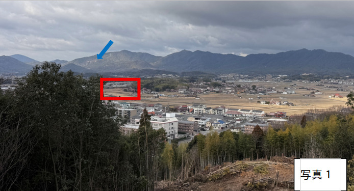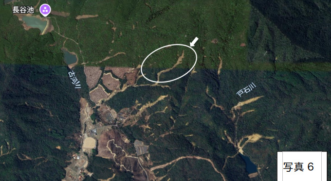 前回の陣が平活動中にSYG一会員が、切り開いた山腹から西側を見た際、山肌が茶色い箇所があるのを見つけられ、「開発または山崩れ?」との疑問を持たれました。(写真1の青矢印部)