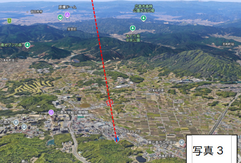 この方向には自衛隊の原演習場と、その西側の山には多くの崩れた跡が見受けられました。探索の場所はこのどれかと思われます。特に原演習場には土木工事で山肌が削られた場所もあります。このままでは場所の特定が難しいので3D表示してみました。(写真3)