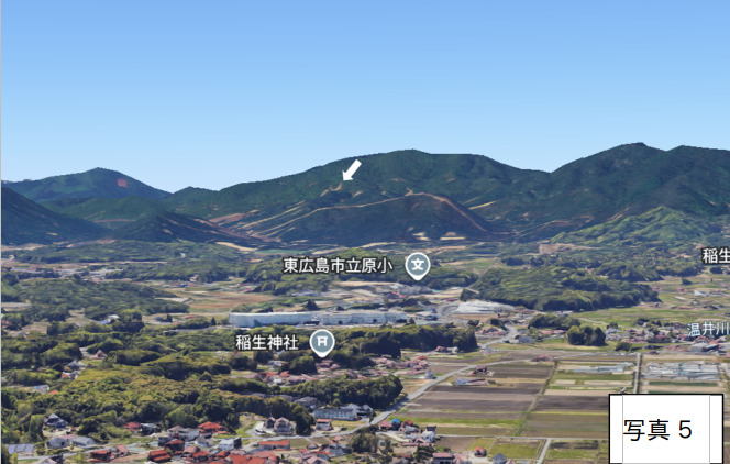角度を低くした3D写真(写真5)にしたら、山の陰になっている場所が隠れ探している跡に似た場所が浮き上がってきました。右上がりの地肌であり、探している跡はこの場所(白矢印)と考えられます。