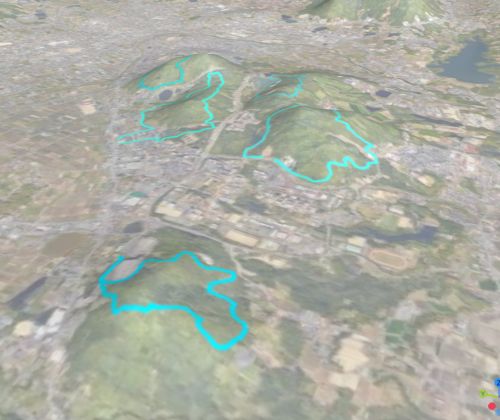 のルートである。視点は自由に動かすことができるので、二神山の西側上空から東方向を眺めてみた。
